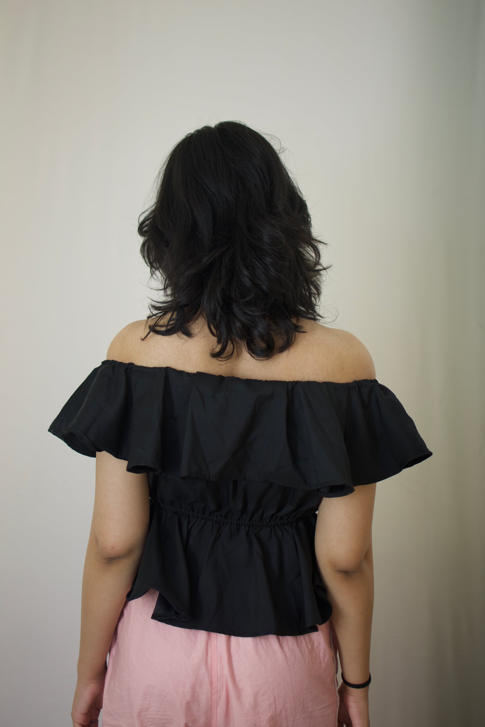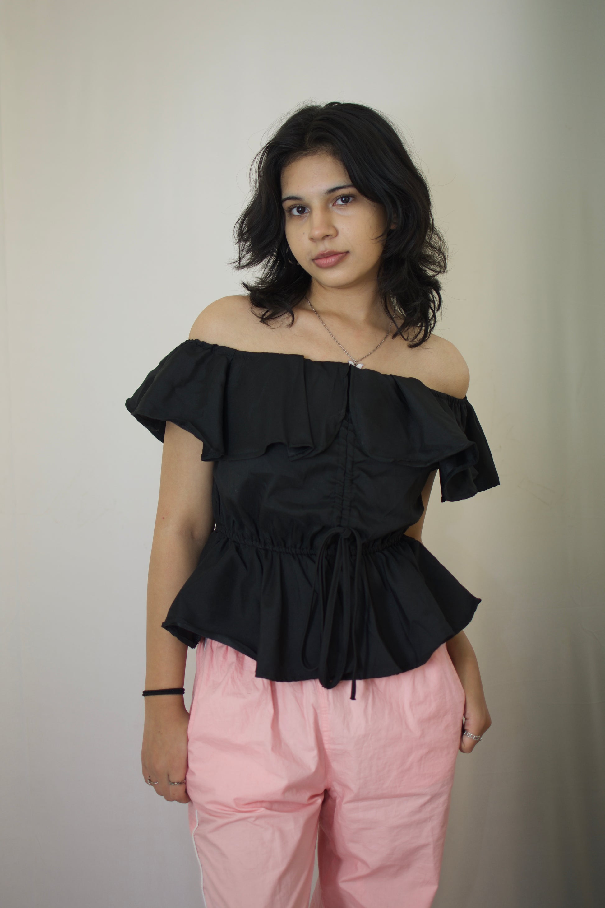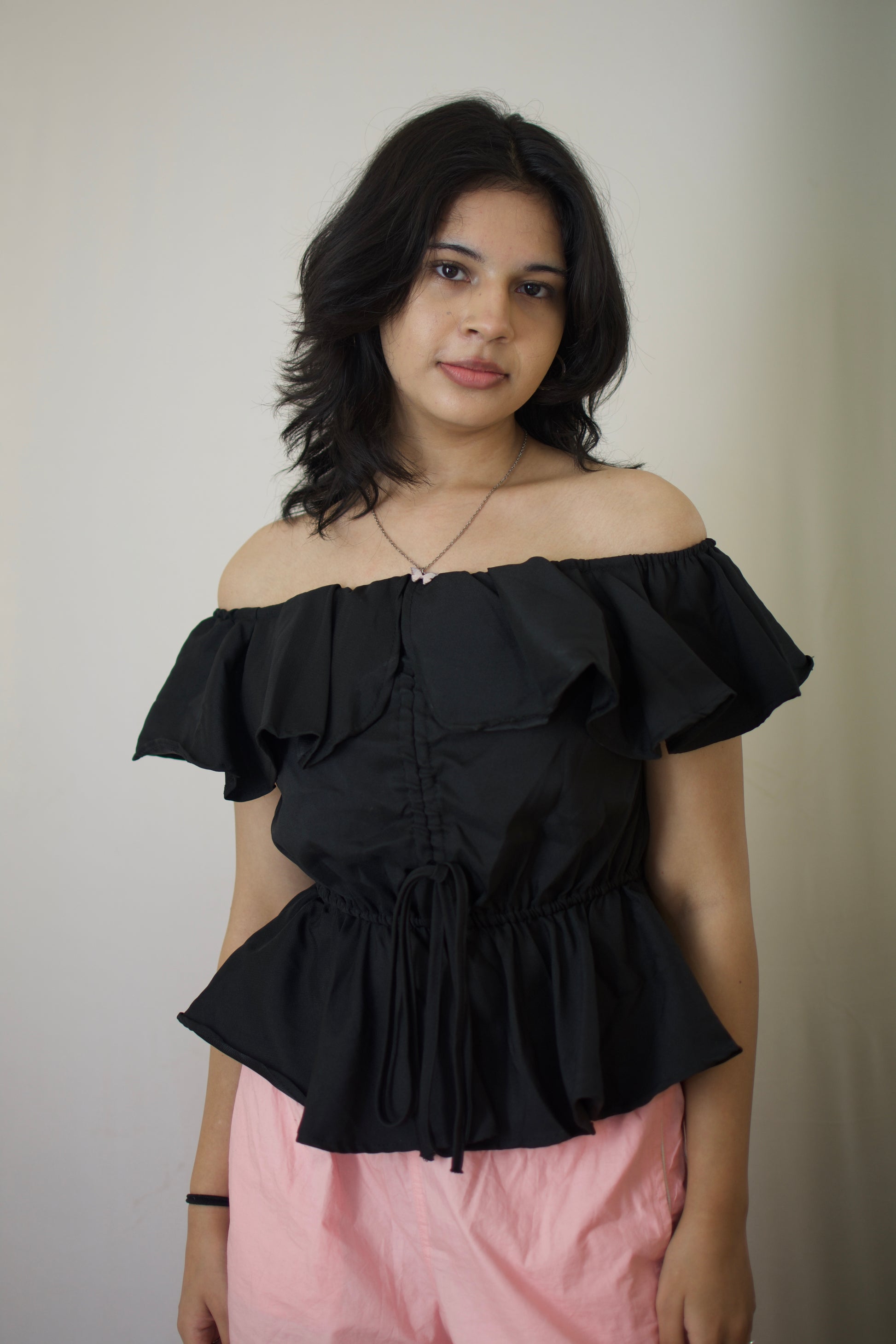 Elevate your wardrobe with this chic black off-shoulder peplum top. Designed with delicate ruffles and a cinched waist for a flattering silhouette, this top is perfect for both casual outings and evening soirees. The adjustable drawstring at the waist ensures a custom fit, while the soft, lightweight fabric adds to its comfort. Pair it with jeans or a skirt for a versatile and stylish look.